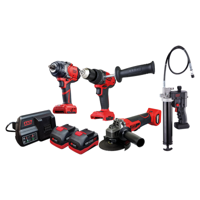 Pack d’outils électroportatifs avec clé à chocs 1/2", perceuse visseuse, pompe à graisse et meuleuse d'angle (18V, 5Ah)