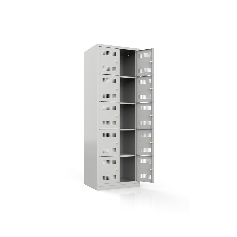 Ce modèle de vestiaire SORI est idéal pour le rangement des effets du personnel. Effectivement, le meuble est composé de 10 cases (290 x 470 x 370), le tout verrouillé par une fermeture cadenassable. La porte battante indégondable est montée sur pivots.